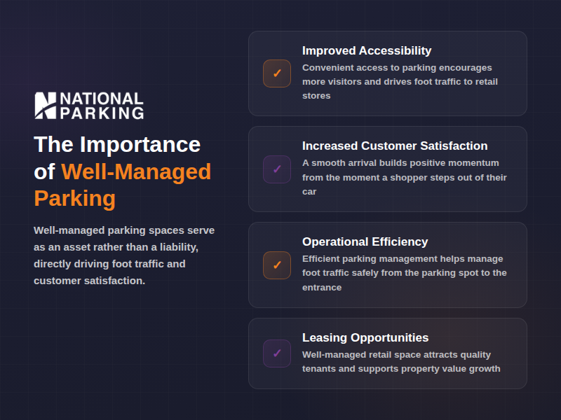 The key benefits of a well-managed parking structure include improved accessibility, increased customer satisfaction, and increased operational efficiency. Convenient access to parking encourages more visitors and drives foot traffic to retail stores, while inadequate parking can be a significant deterrent, discouraging customers from visiting due to the perceived hassle.