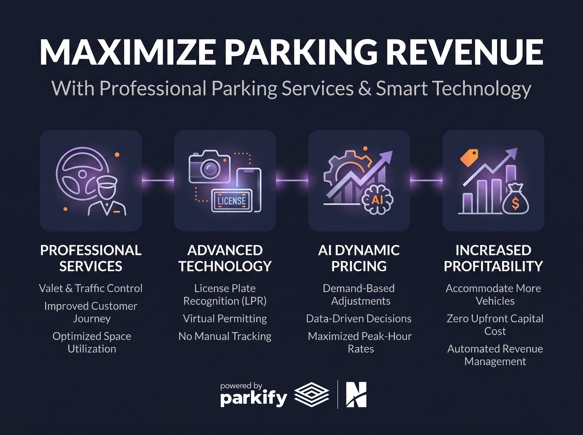 National Parking’s software, Parkify, takes this a step further with AI-powered dynamic pricing models that automatically adjust rates based on real-time data. Property owners don’t need a traditional parking management company to run the system. Parkify’s platform handles enforcement, payment processing, and parking revenue management automatically, with zero upfront capital costs.
