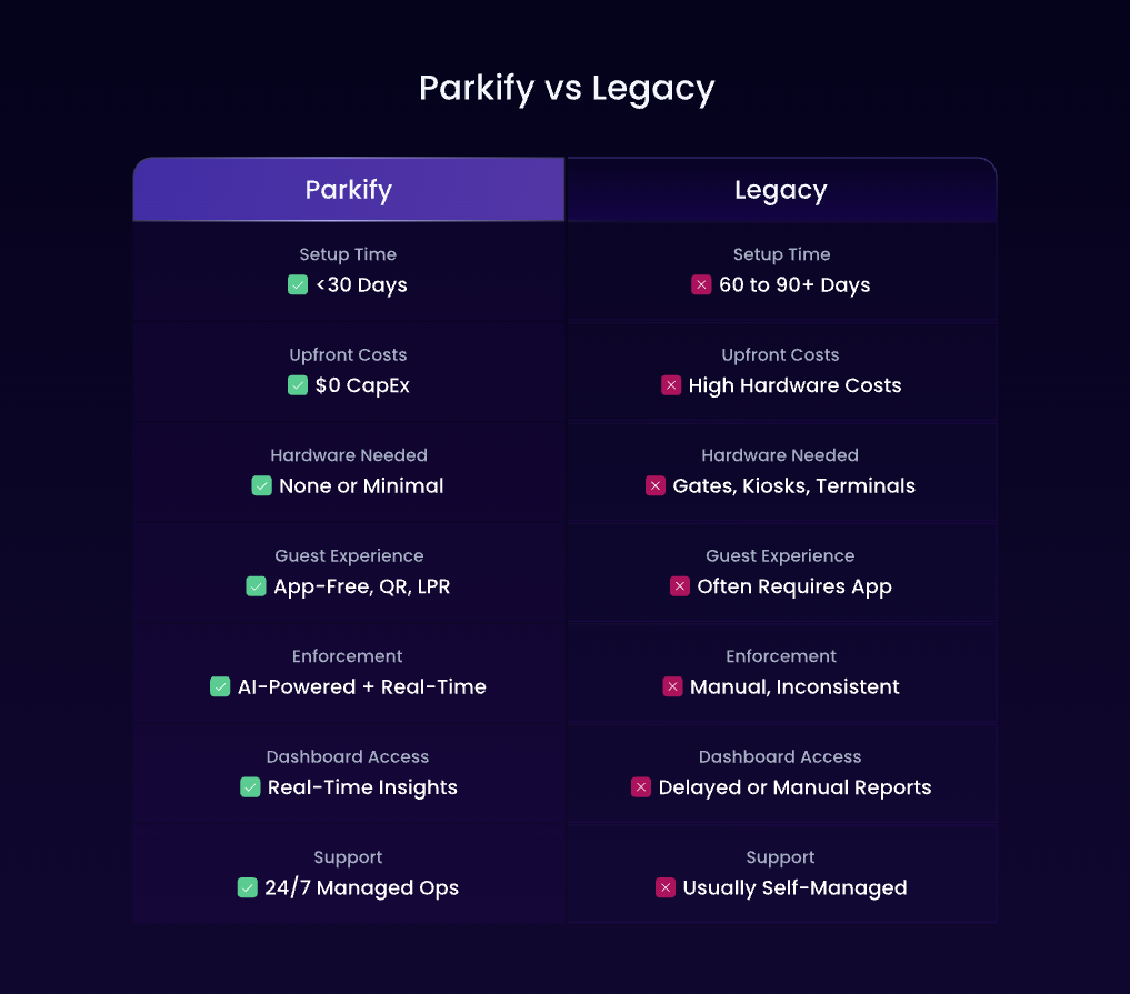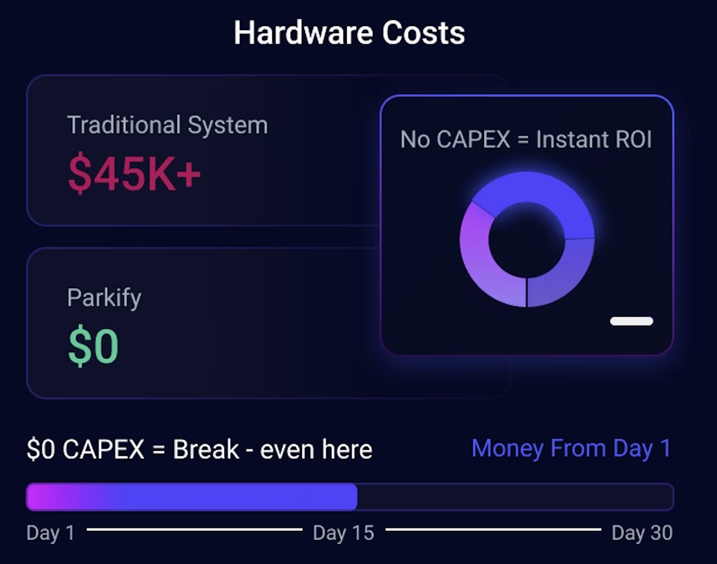 Parkify delivers what traditional parking management systems can’t: zero upfront costs, automated parking enforcement, and user experience that keeps guests happy.